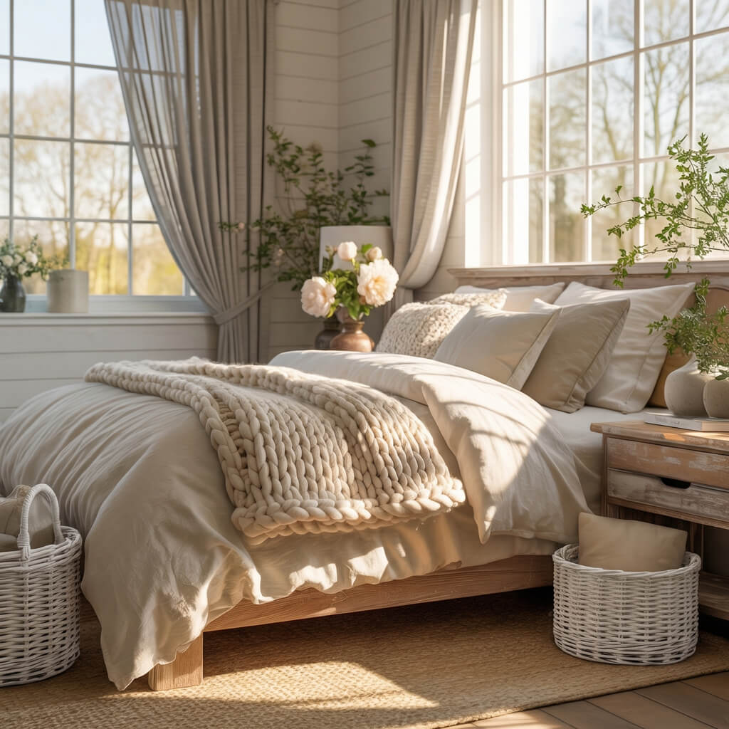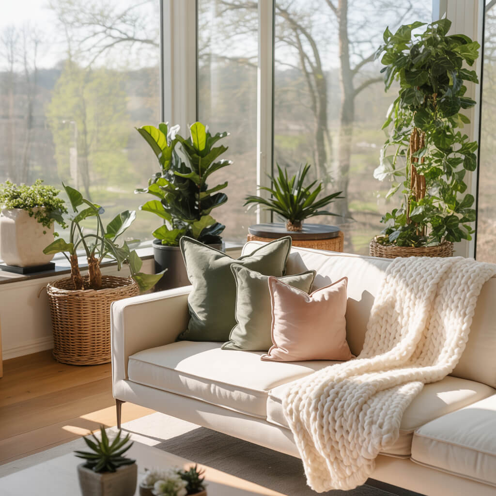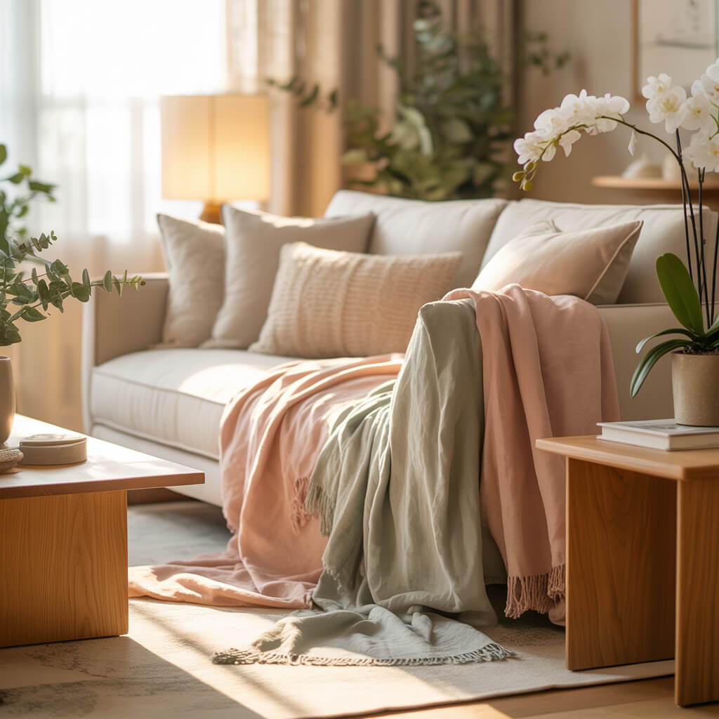 Banish the heavy wool and faux fur. Bring in throws in linen, cotton, or light waffle weaves in creams, sage, or soft sky blue. Drape them casually over a sofa arm or chair.