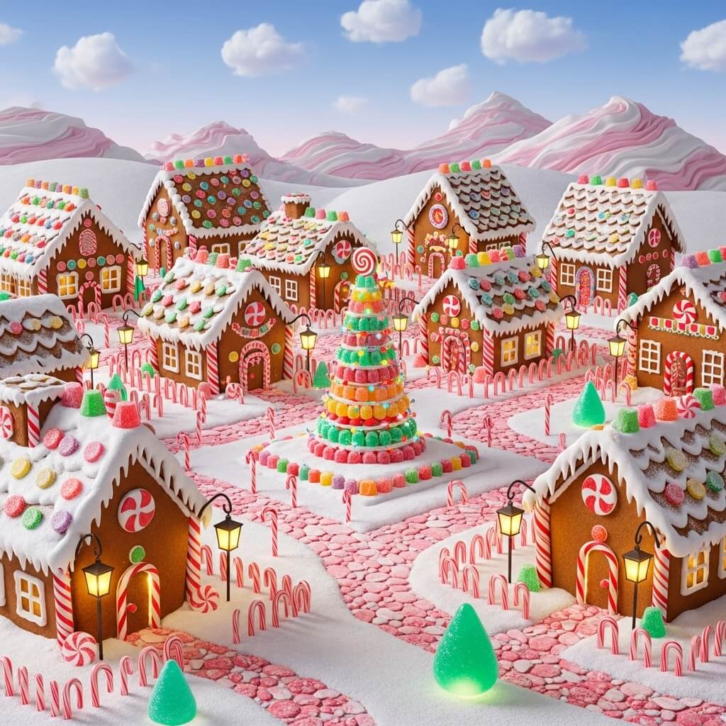 Who says a Christmas village has to be realistic? Unleash your inner child and create a candy-themed wonderland. Use striped candy canes as lamp posts, scatter colorful gumdrops and peppermints, and maybe even include a house that looks like it’s made of gingerbread.