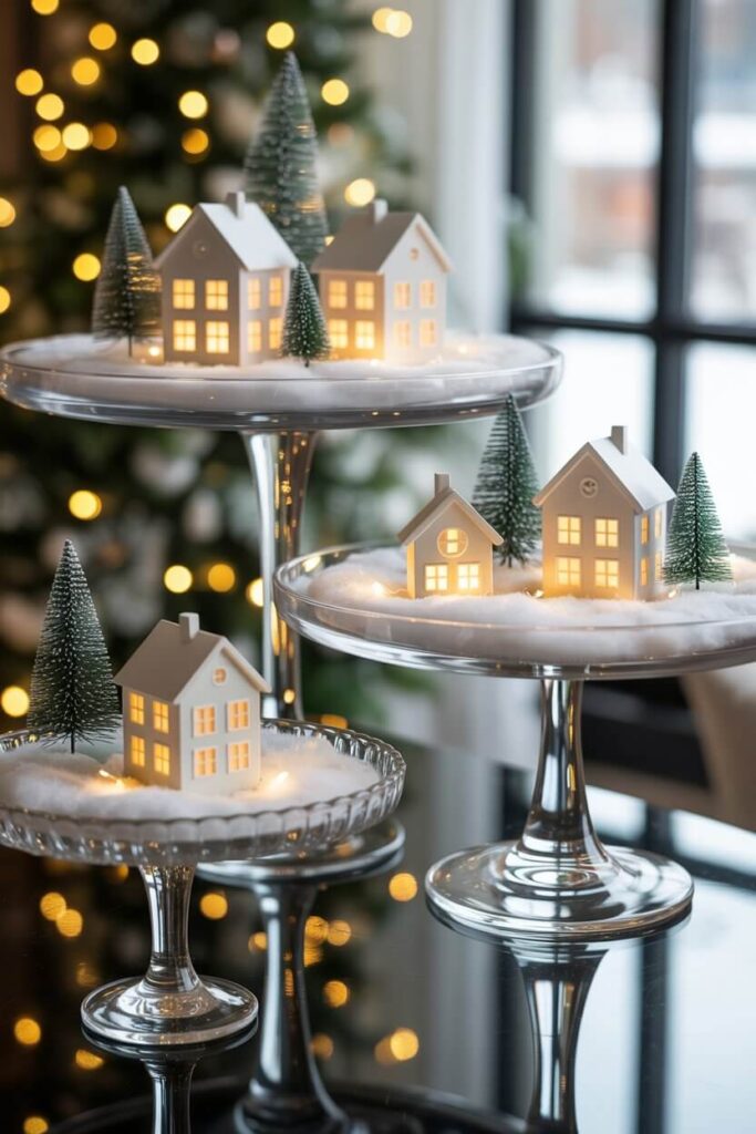 For a quick, elegant, and space-saving solution, raid your kitchen cabinets. Use two or three cake stands of varying heights. Place a house or a small vignette on each one. This creates instant levels and visual interest with almost zero effort.