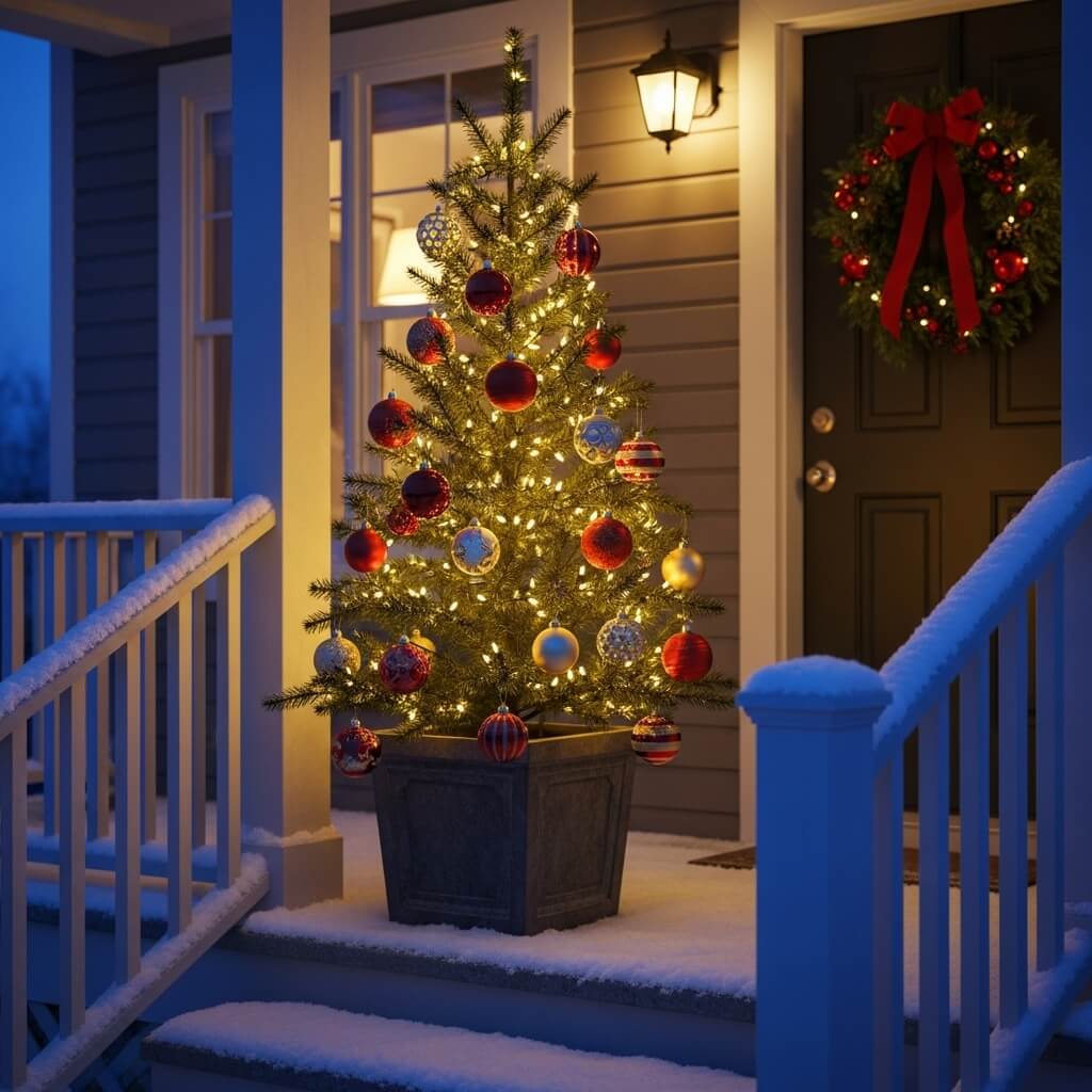 Have a small, spare tree? Give it a job outside! Place it on your front porch in a weatherproof planter. Decorate it solely with outdoor-rated lights and a few shatterproof red or gold balls. It’s an incredibly welcoming sight that guides your guests to your door.