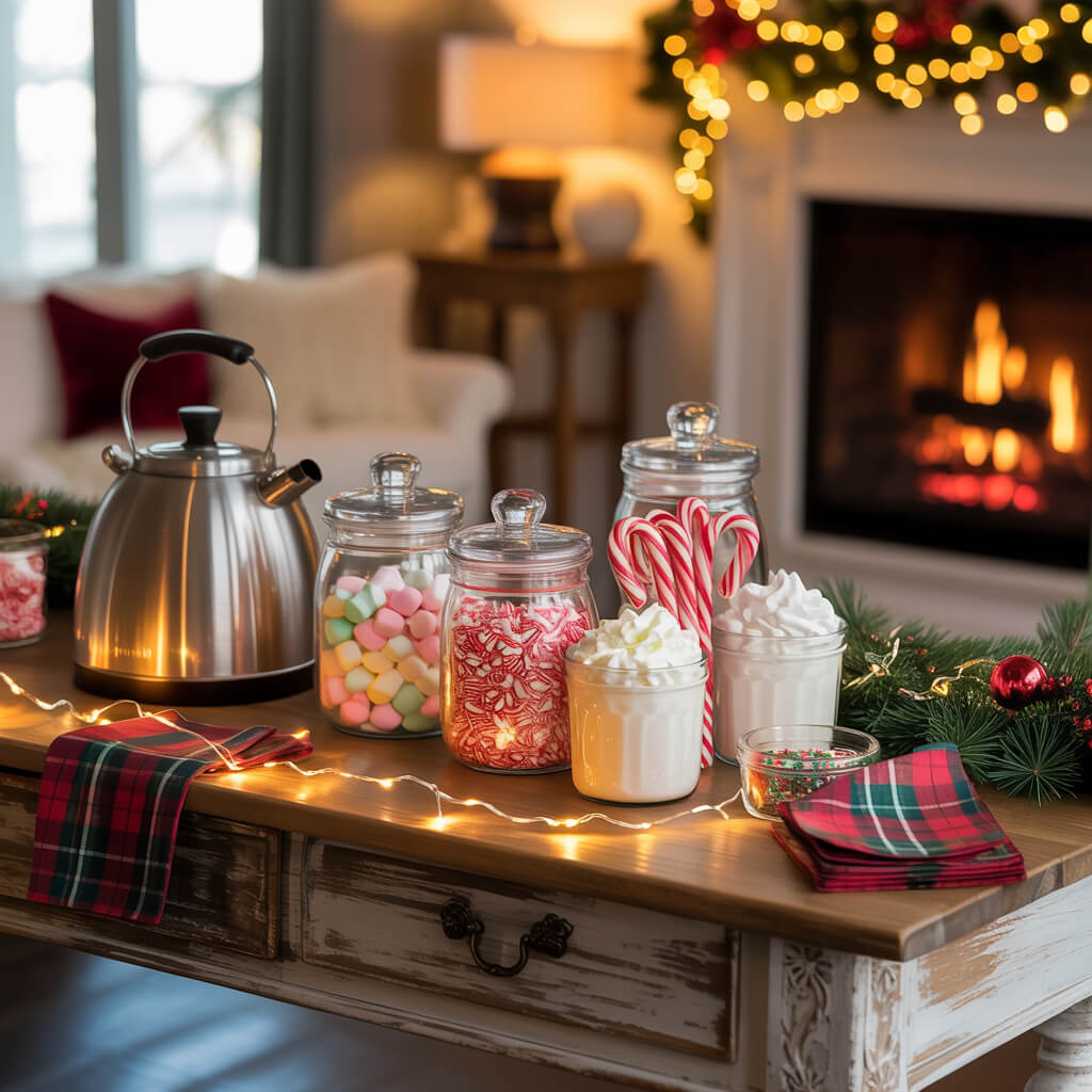 Think mini marshmallows, crushed candy canes, whipped cream, and sprinkles. It’s an interactive piece that encourages guests to cozy up and indulge.