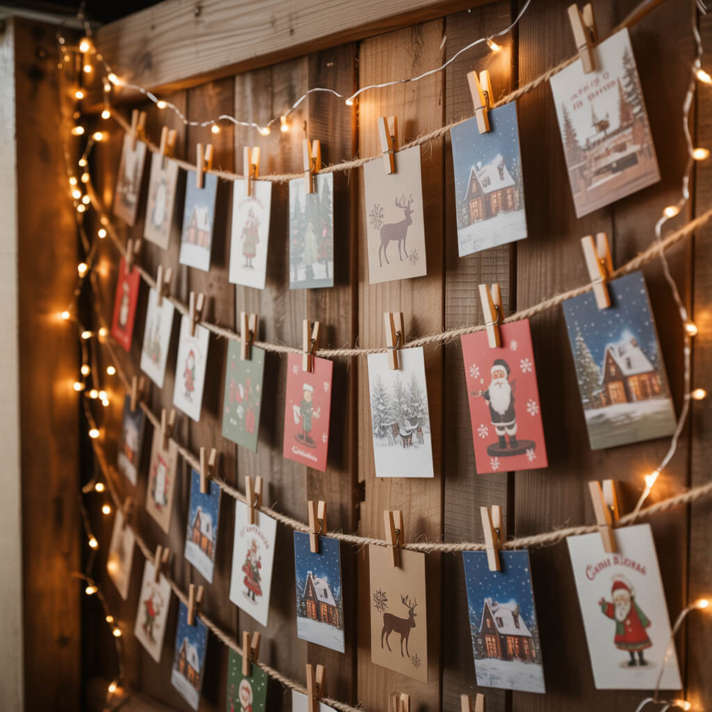 You can hang a piece of rustic twine with mini clothespins, frame your doorway with them, or even create a card “tree” shape on a wall.