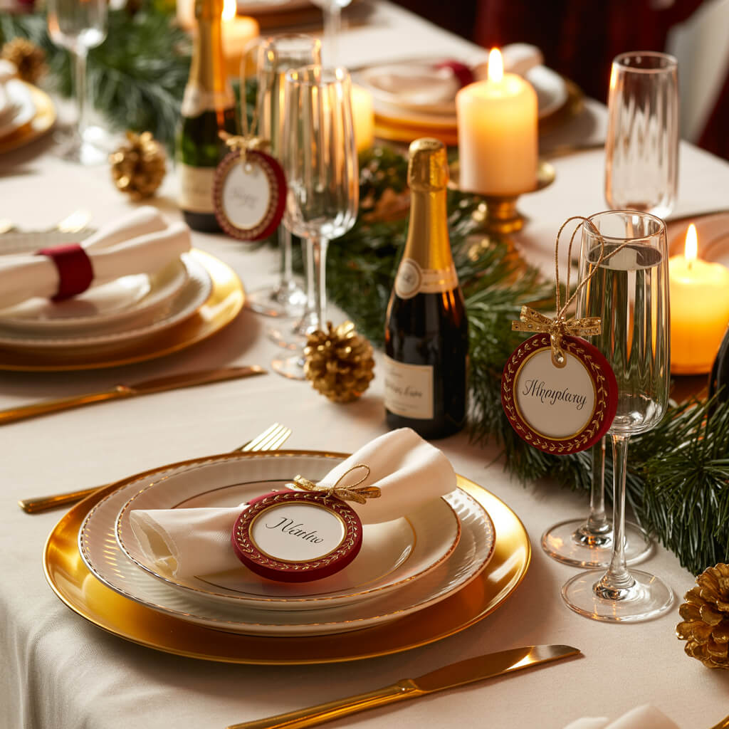 Write your guests’ names on ornament tags tied to their napkin. A small, festive treat like a mini bottle of champagne or a personalized cookie at each seat makes everyone feel special.