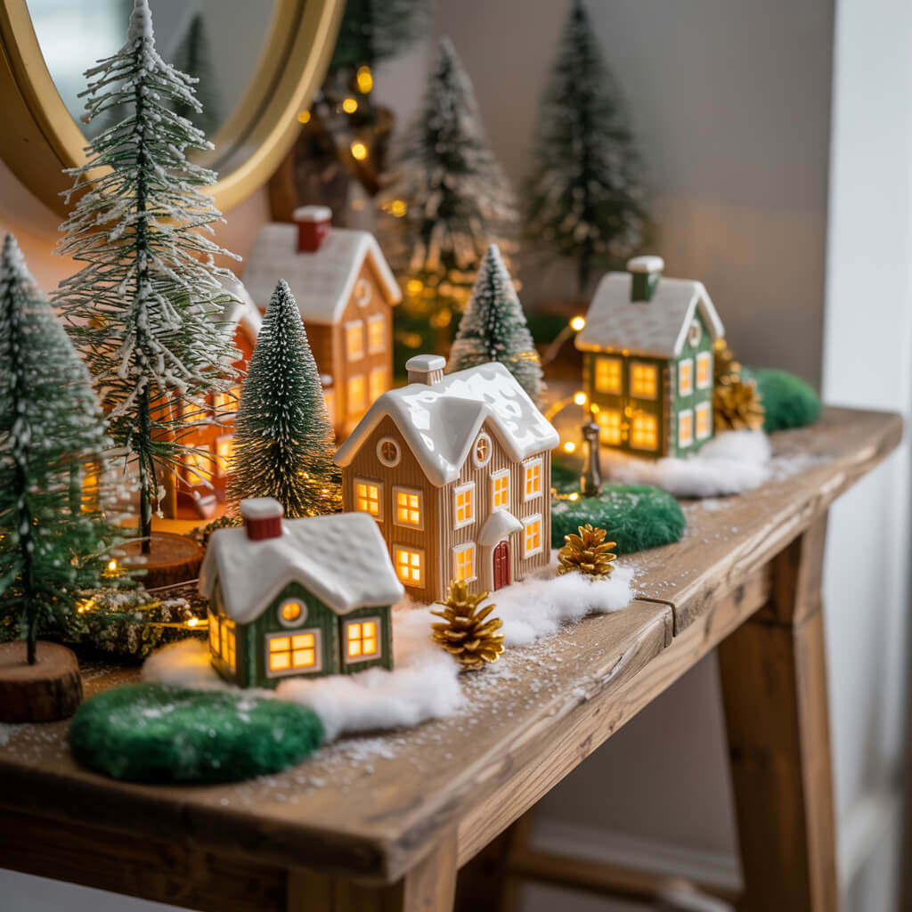 Bring a little storybook charm to a console table or bookshelf. Set up a miniature Christmas village, but let’s get creative with it.