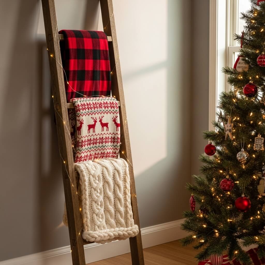 Practicality meets style with this one. Lean a simple wooden blanket ladder in your living room corner and drape it with your coziest Christmas-themed throws.