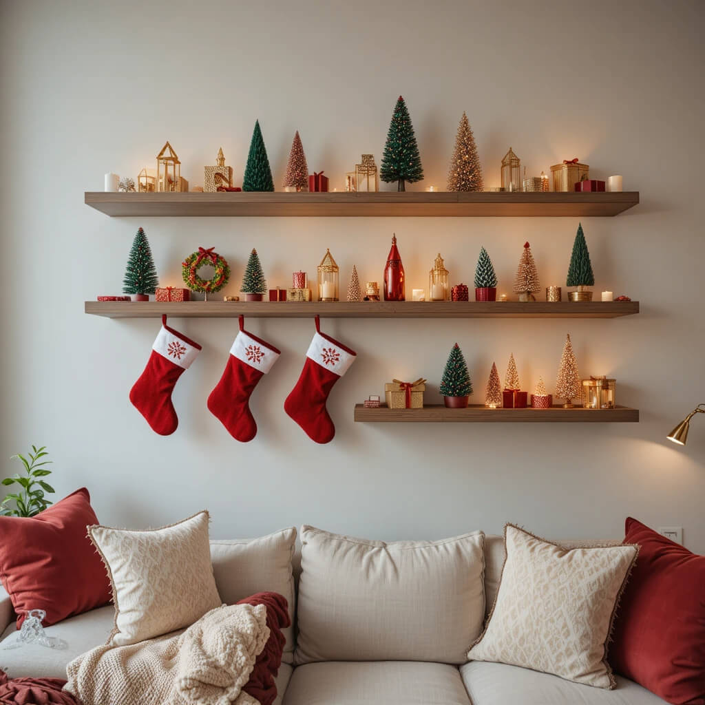 Tackling Christmas decor in a small space? This one’s for you. Style your existing floating shelves with mini stockings, tiny trees, and festive figurines.