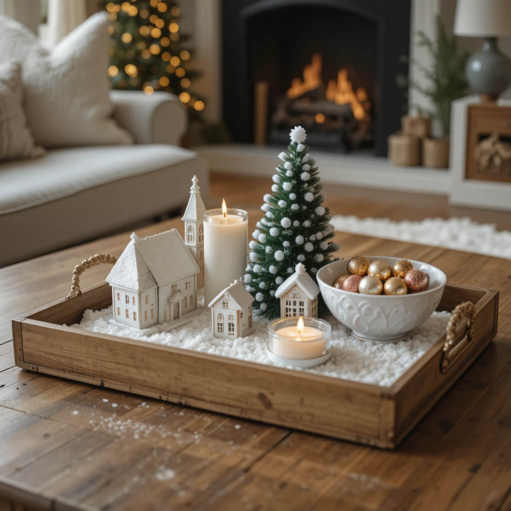Corral your smaller Christmas Decor items on a stylish tray. This keeps your coffee table looking curated, not cluttered. Add a mini village house, a tiny tree, a festive candle, and maybe a small bowl of ornaments.