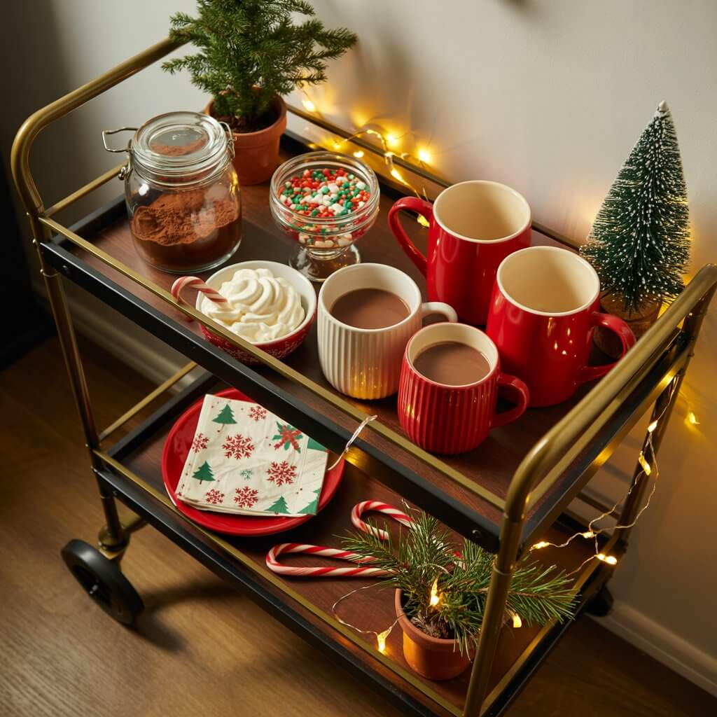 Dedicate a corner of your console table or a rolling cart to the ultimate cozy beverage. Set out a cute mug, a dispenser of cocoa, whipped cream, peppermint sticks, and sprinkles. It’s functional, adorable, and encourages festive gatherings.