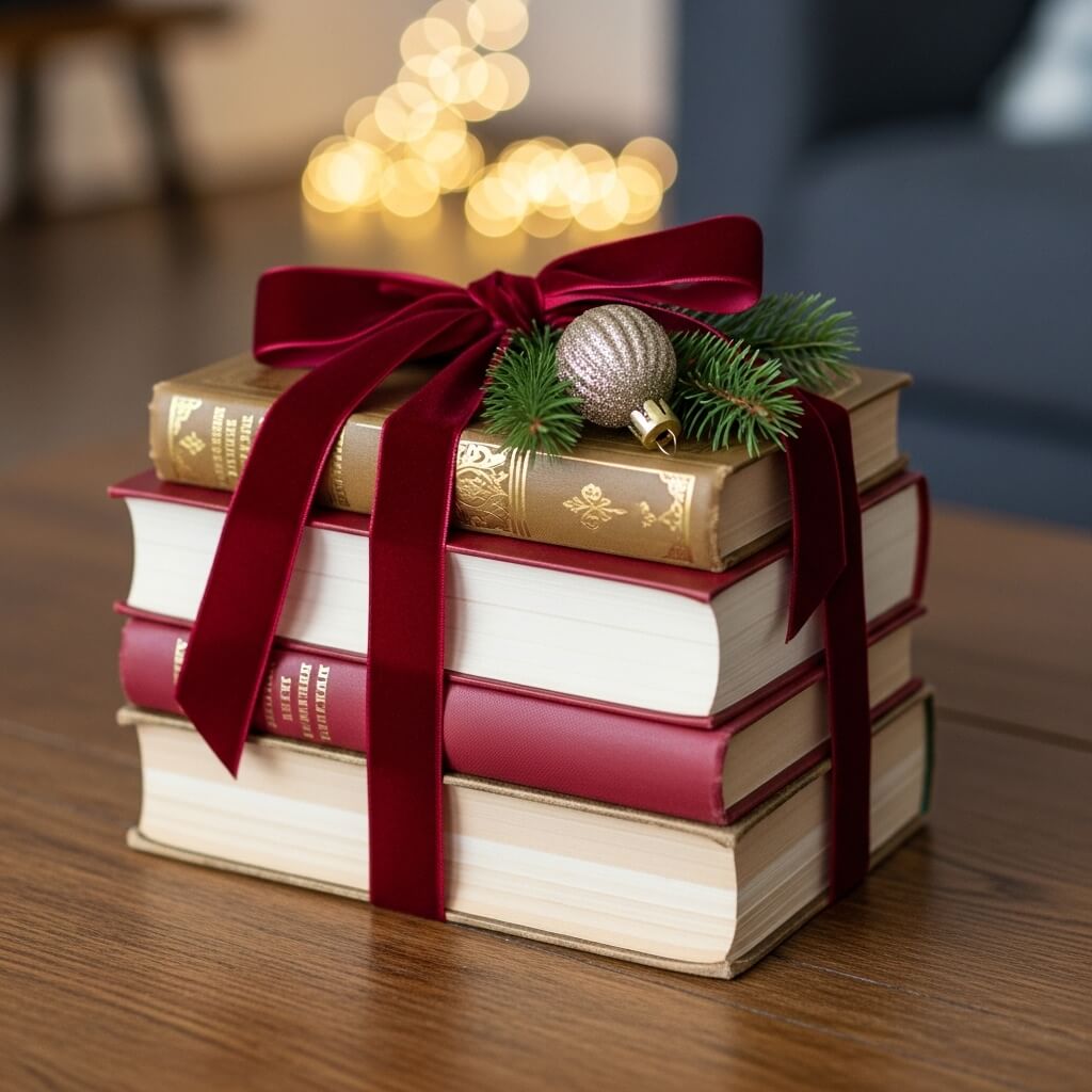 Grab a few beautiful books from your shelf and tie them together with a festive ribbon. Top with a small ornament, a pine sprig, or a vintage-style bell. Place it on your coffee table or stack it on the hearth. It’s a subtle, literary nod to the season.