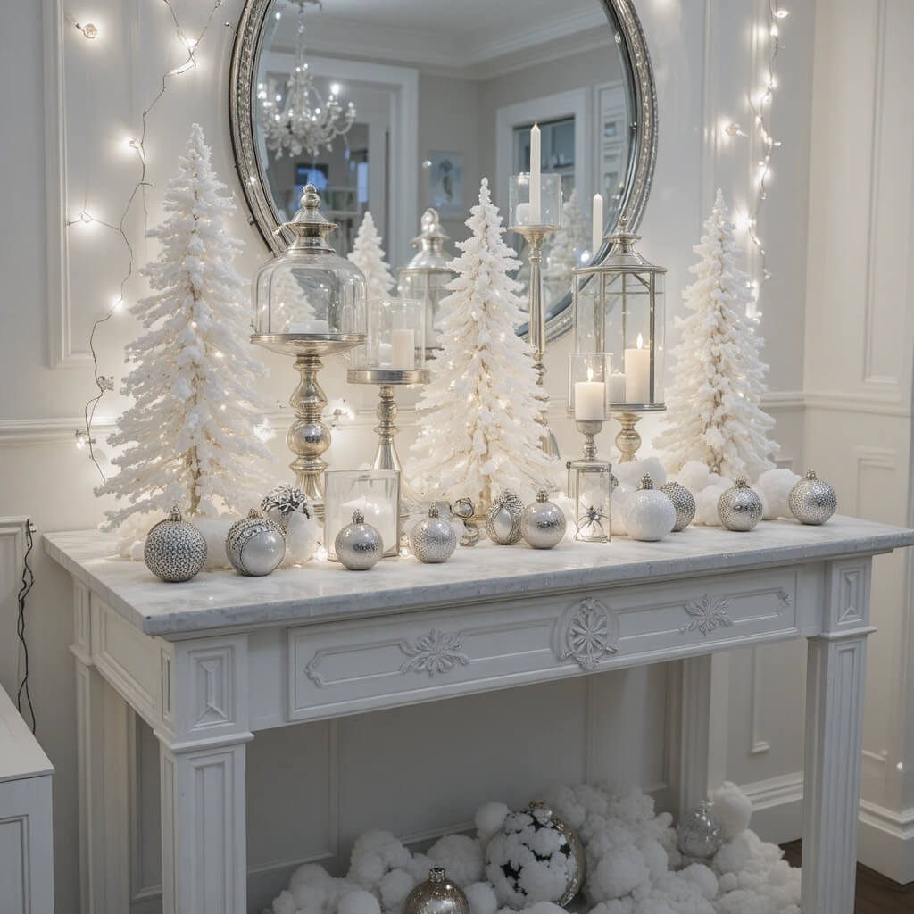 Dedicate a shelf or a console table to a all-white and silver theme. Use white trees, glittery houses, silver ornaments, and faux snow. It feels elegant, frosty, and incredibly chic amidst all the traditional red and green.