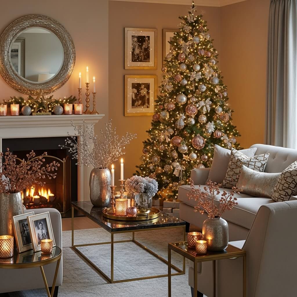 Incorporate touches of gold, silver, or rose copper through decorative objects. Think metallic picture frames, candle holders, vases, or even a collection of shiny ornaments piled into a decorative bowl. This is what makes your Christmas Decor “glam.”