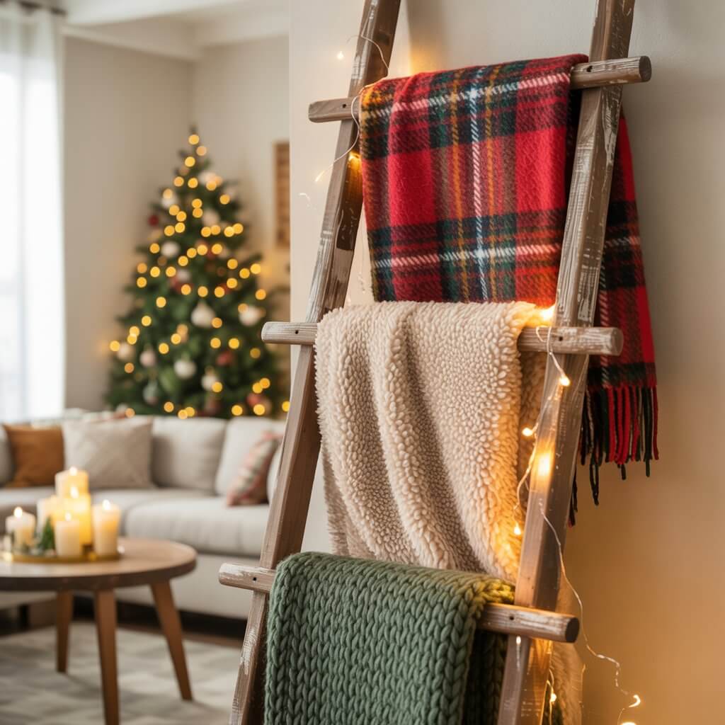 If you don’t have a blanket ladder, this is your sign to get one. It’s a functional art piece! Drape it with your coziest throws—think cable knit, sherpa, or tartan—in festive colors. It adds vertical interest and promises warmth.