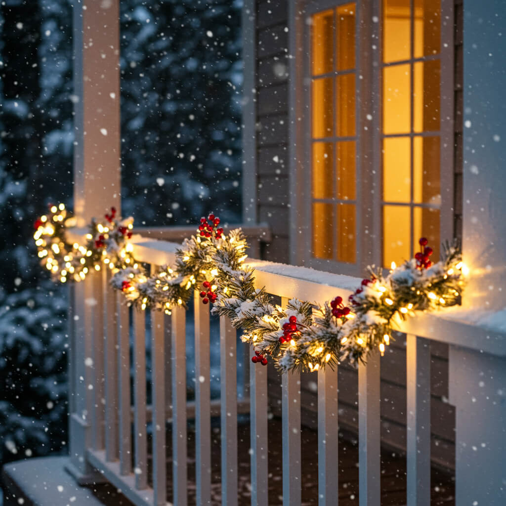 Dust your porch railings with a layer of faux snow spray or drape a fluffy, snow-like garland across it. It creates a perfect winter wonderland scene, even if you live somewhere it never snows.