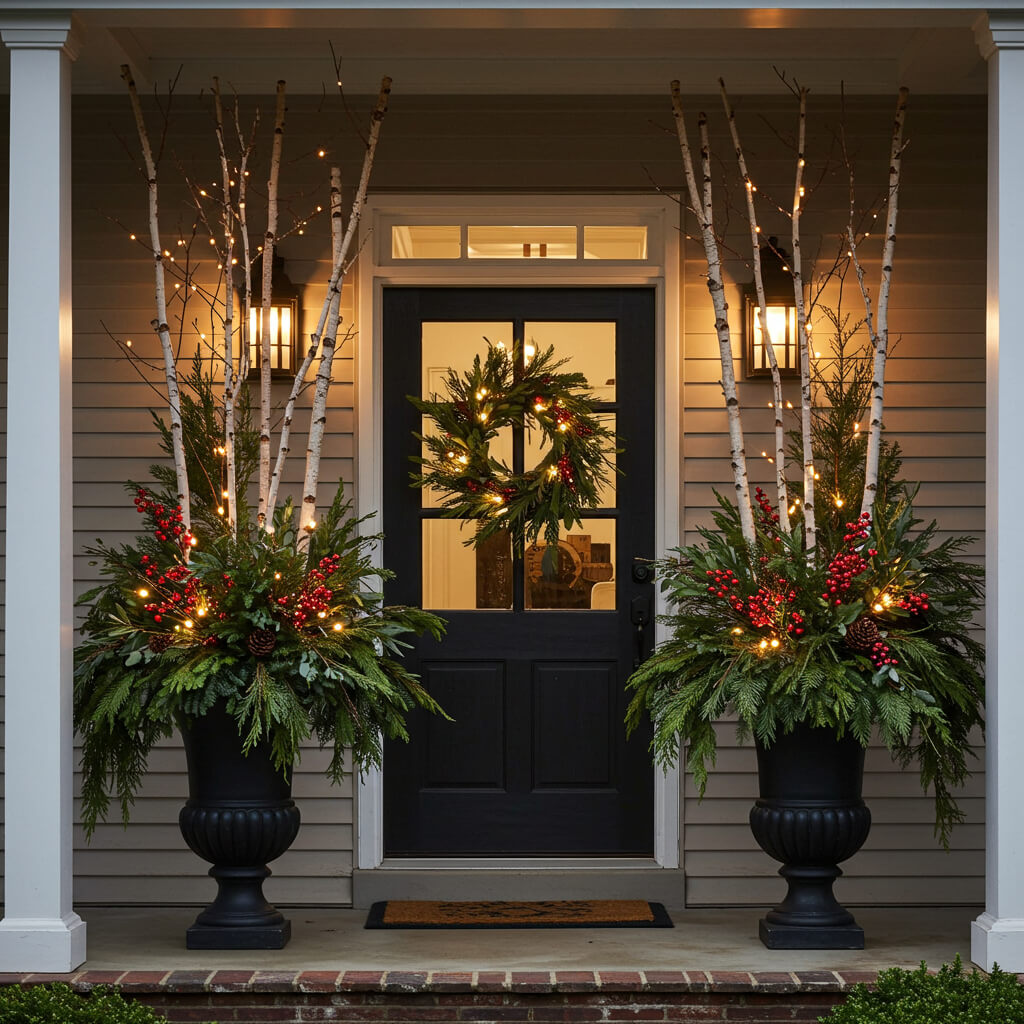 Forget boring shrubs. Flanking your door with two large urns or planters packed with seasonal greens is a serious power move. Mix textures like cedar, fir, and boxwood for a professional-looking display.