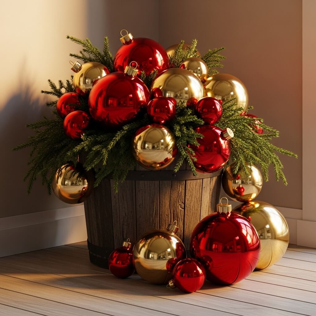 Take those giant, shatterproof ornaments and artfully arrange them in a large planter or basket. Tuck them in among some greens or let them spill out onto the porch. It’s an unexpected and super modern touch.