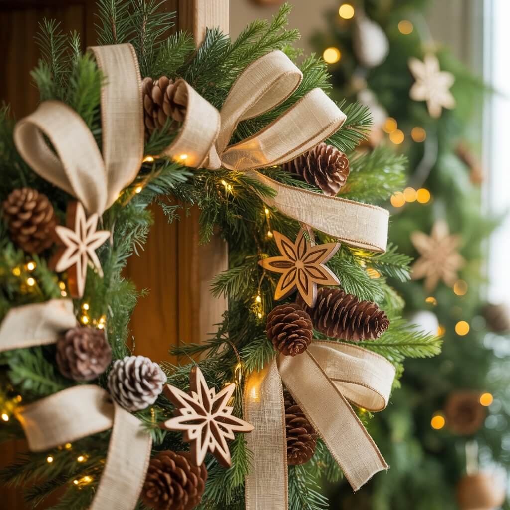 Swap out your shiny satin ribbons for wide burlap ones on your wreath and garland. It instantly gives your decor a cozy, rustic, and farmhouse-friendly feel.