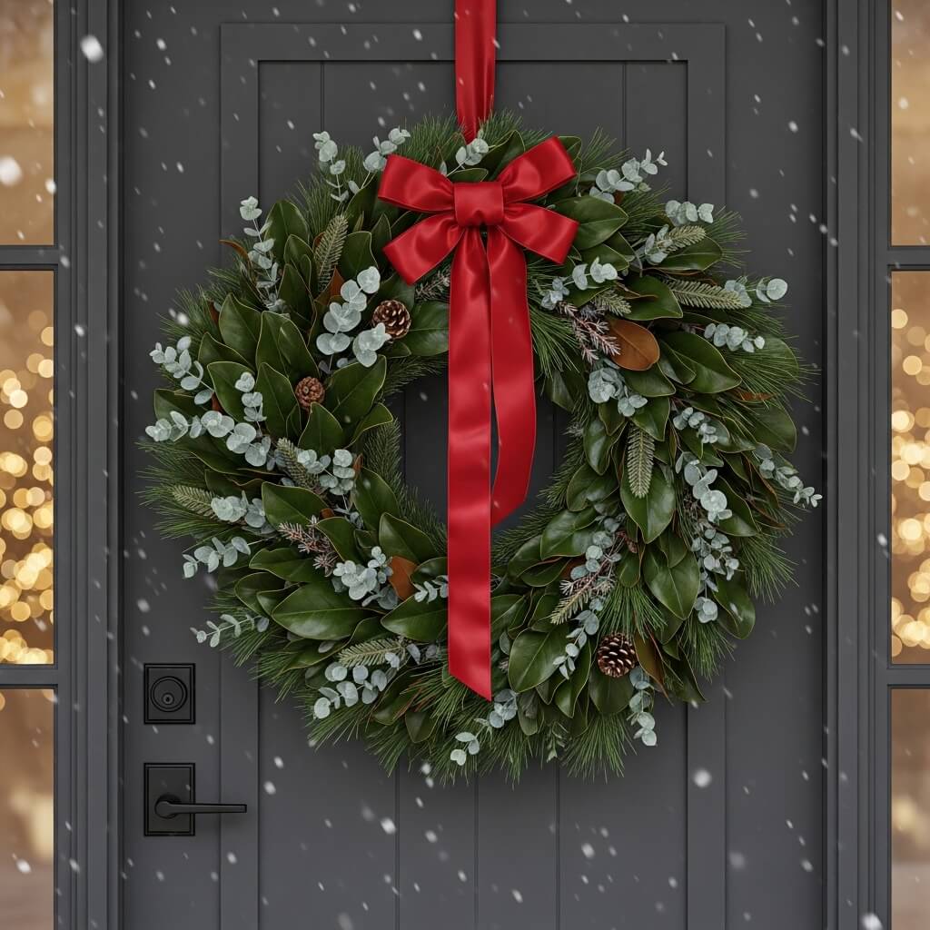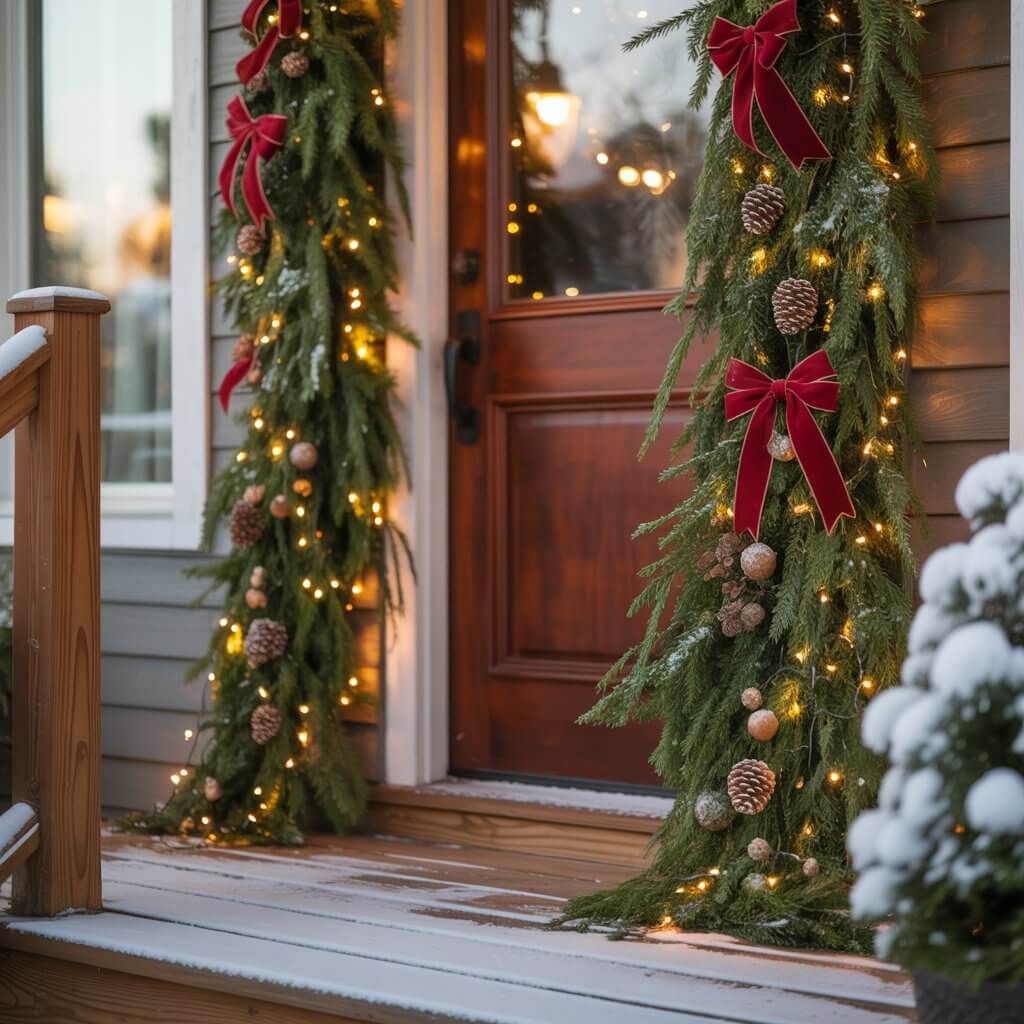 Your wreath is the centerpiece of your Christmas Porch Decor. Why settle for basic? Go for something that makes a statement, whether it’s oversized, features a fun motif like a truck with a tree, or is dripping with eucalyptus and magnolia leaves.