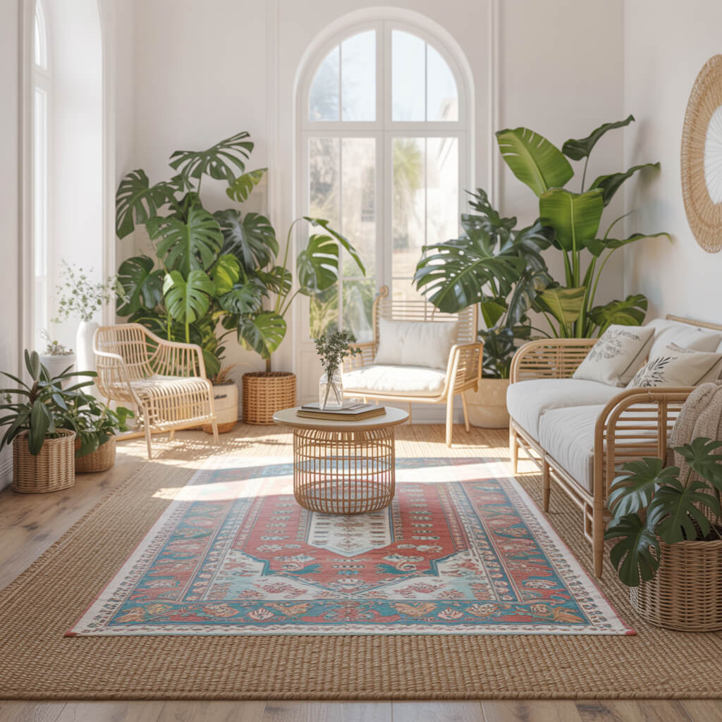 One rug is fine, but two? That’s Boho magic. The classic move is layering a smaller, patterned rug over a larger, neutral natural fiber one like jute or sisal.