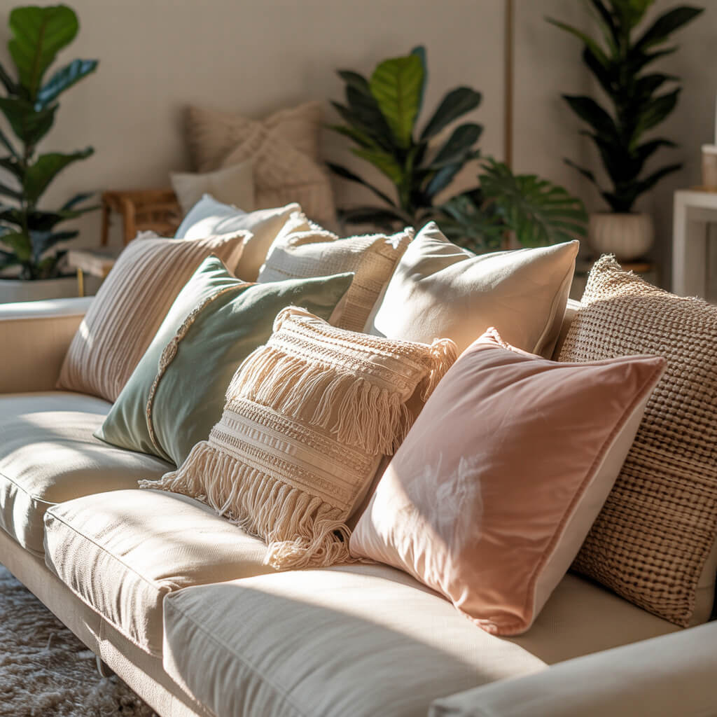 The quickest way to a Spring Boho sofa? A pile of pillows that look like they gathered themselves over time. The key is cohesion through color or texture, not matchy-matchy prints.