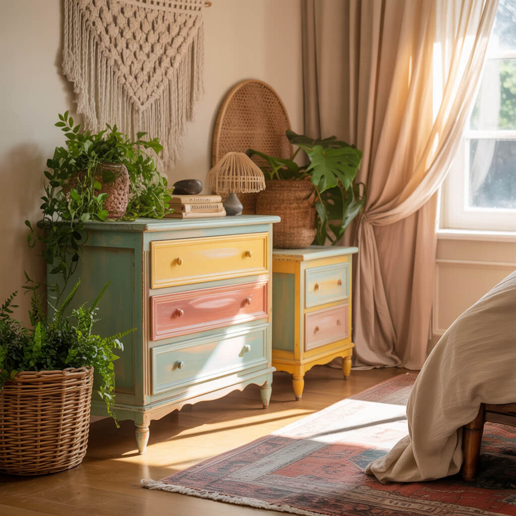 A dated wooden dresser or nightstand is a Boho blank canvas. Paint it in a Spring hue like seafoam green, buttery yellow, or a washed-out terracotta.