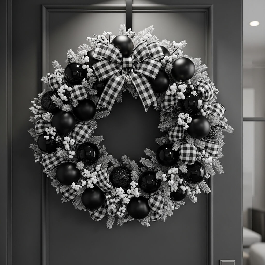 Feeling a little edgy? Ditch the traditional colors for a sophisticated monochrome palette. A black and white buffalo check ribbon paired with black berries and white ornaments is modern, chic, and seriously cool.