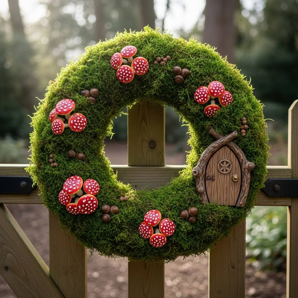 Step into a fairytale with this utterly charming and whimsical Christmas wreath. It’s covered in lush green sheet moss and features adorable red-and-white faux mushrooms, acorns, and maybe even a little fairy door.