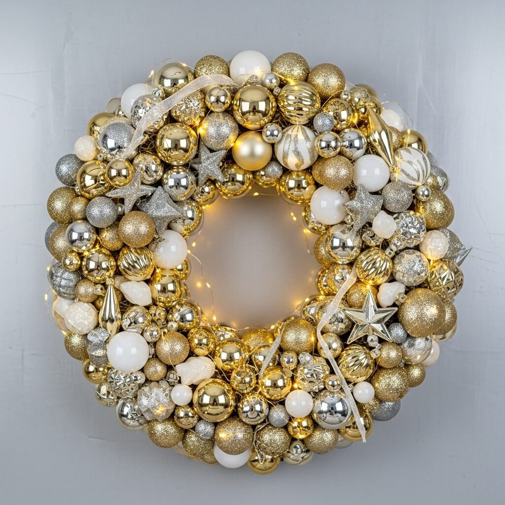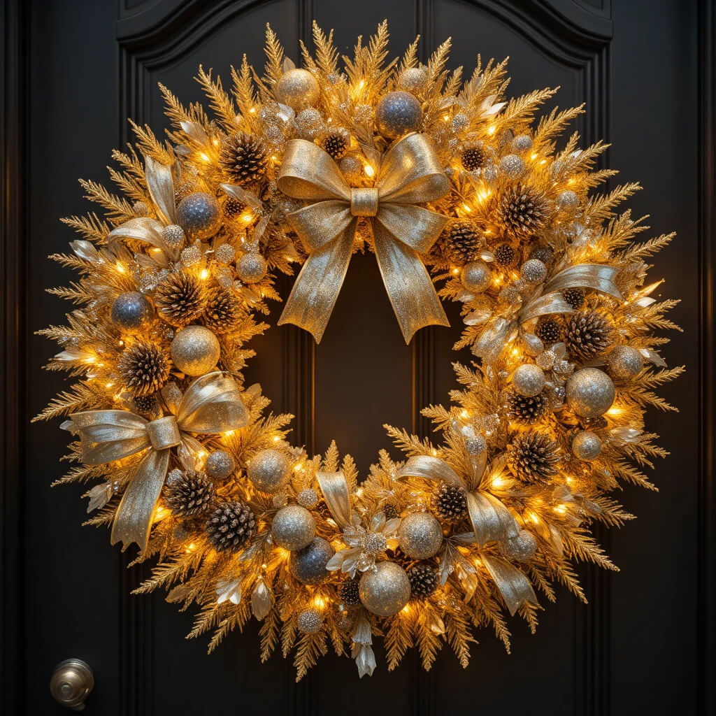 Ready to blind your neighbors with sparkle? This Christmas wreath is for you. Think loads of gold-sprayed pinecones, shimmering ribbon, and strategically placed crystal accents that catch the light. It’s basically a piece of jewelry for your door.