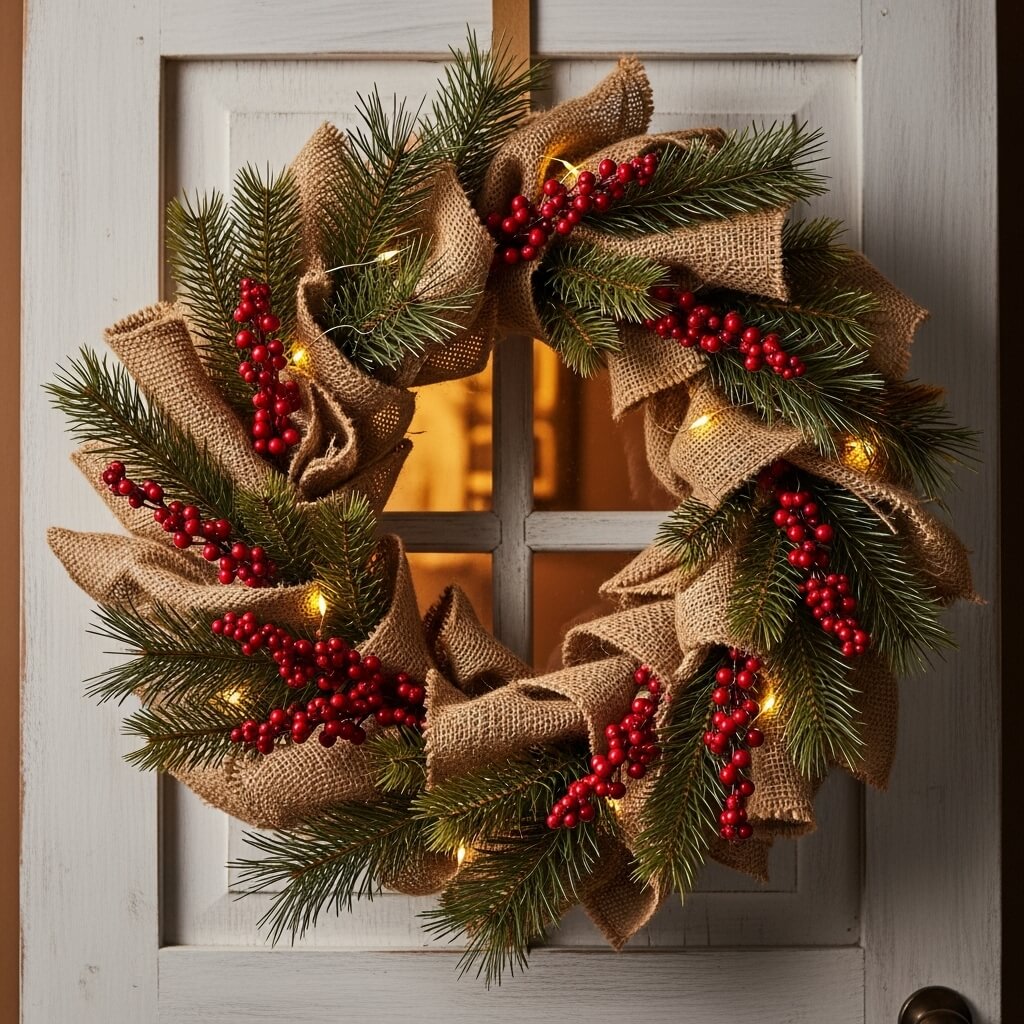 If your style leans more toward farmhouse cozy, this is your winner. The rough texture of burlap paired with the soft pop of red berries creates a look that’s both simple and stunning. It feels warm, handmade, and wonderfully inviting.
