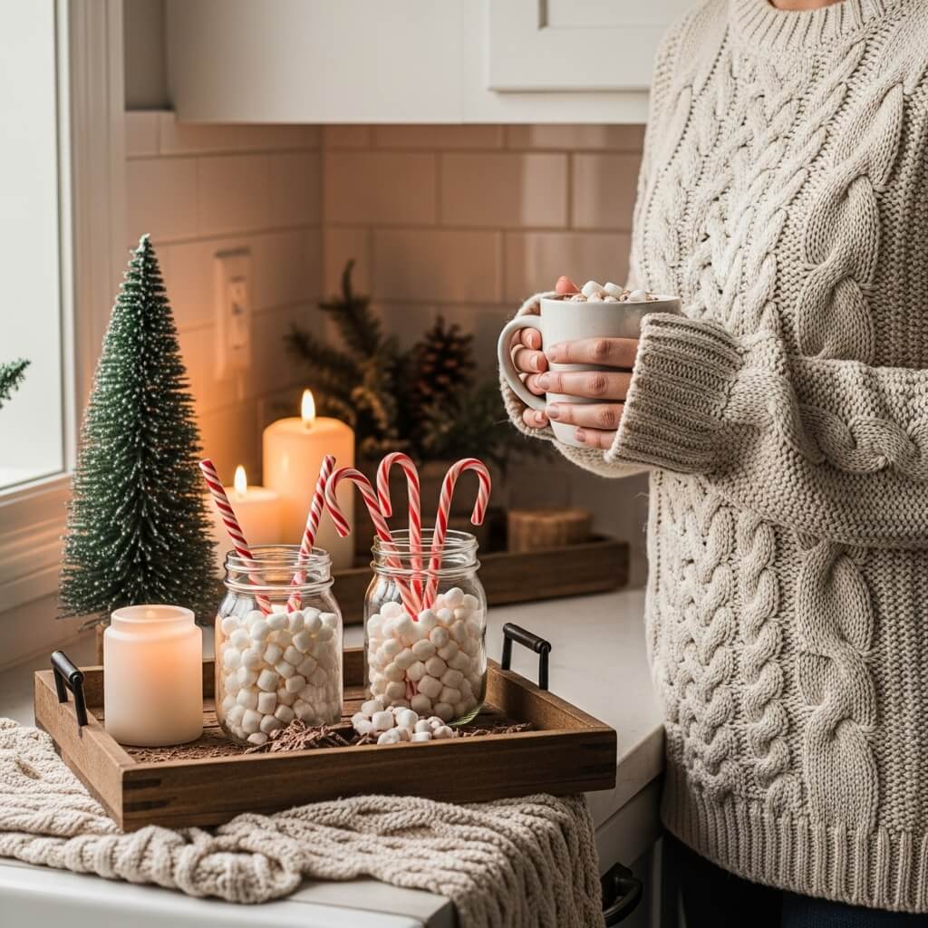 To match that vibe, set up a hot cocoa bar corner in your kitchen or dining space. Include jars of mini marshmallows, candy canes, crushed peppermint, and chocolate shavings. Arrange them neatly in mason jars on a wooden tray — instant rustic charm!
