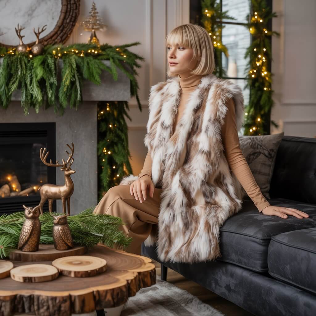 Want to look festive without going full Santa mode? Try a faux fur vest layered over a turtleneck. It’s stylish, warm, and gives major “chic cabin” vibes.