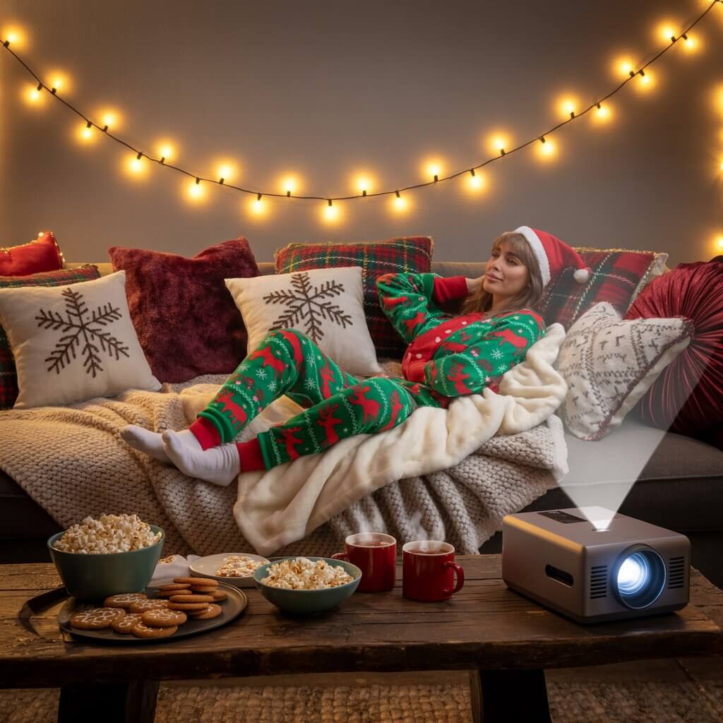 Now, set the scene: a movie marathon setup with string lights, oversized blankets, and a mountain of snacks. Arrange your couch with holiday-themed cushions, dim the lights, and queue up your favorite classics.