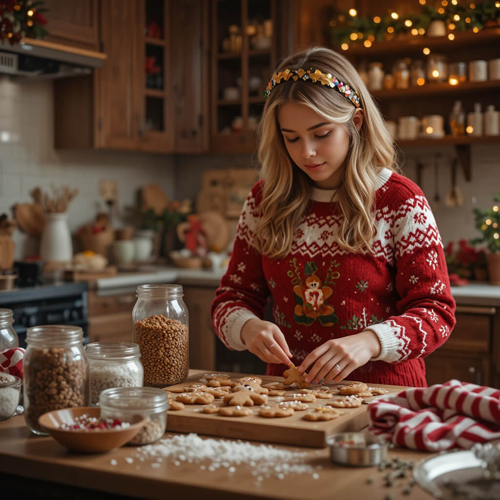 For the decor side, turn your kitchen into a gingerbread-baking haven. Display cookie cutters, sprinkles, and ingredients in clear glass jars. Add a few red-and-white striped towels for a festive pop.