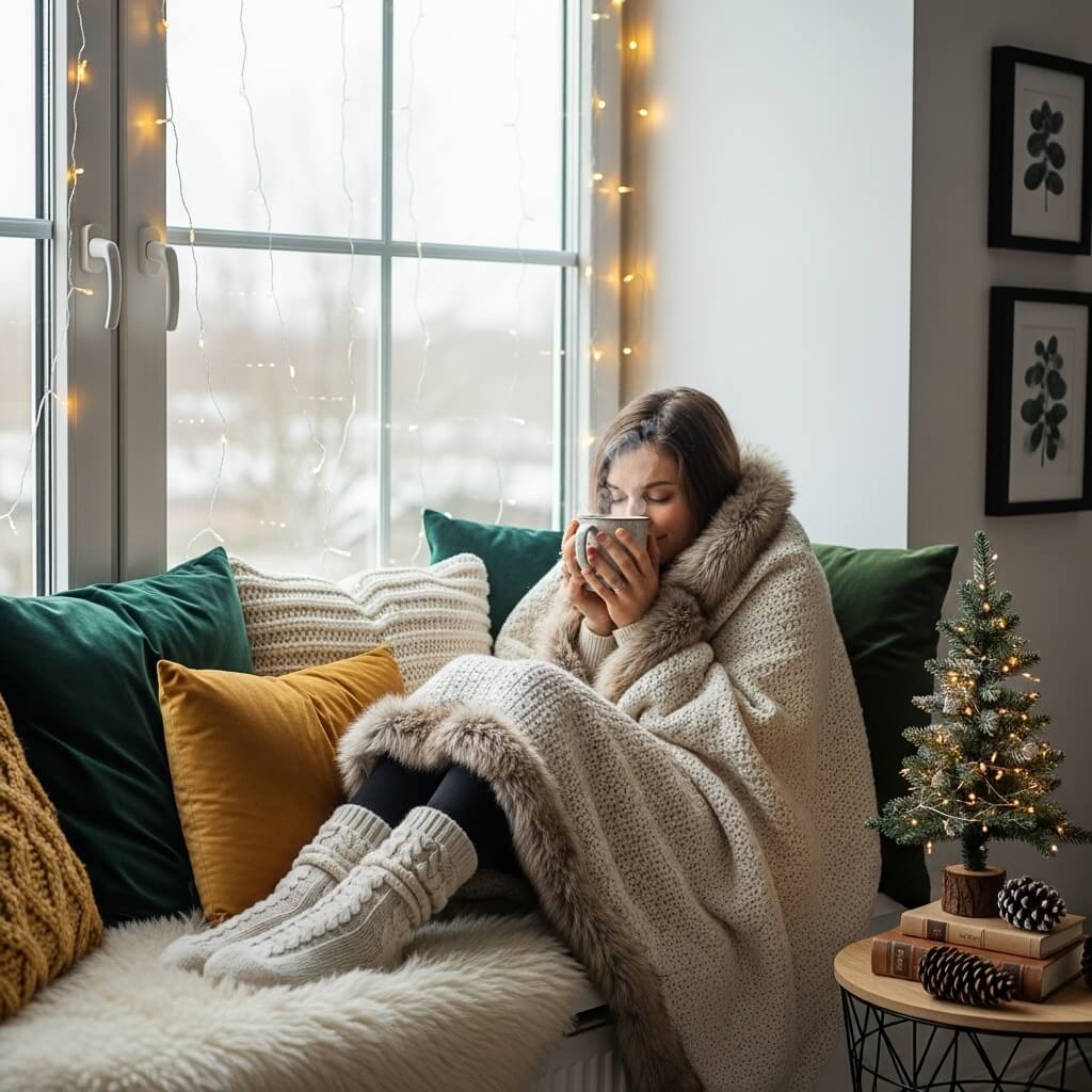 To complete the look, design a winter window nook — add a few plush cushions, fairy lights, and maybe even a mini Christmas tree or wreath. It’s your cozy hideaway for reading, journaling, or just watching the snow (or rain — still counts).