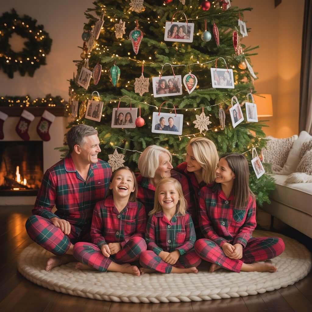 Now, match your outfits with a Christmas tree that tells your story. Mix family ornaments, photo keepsakes, and handmade crafts. Wrap the base with a chunky knit tree skirt (bonus points if it matches your pajamas).