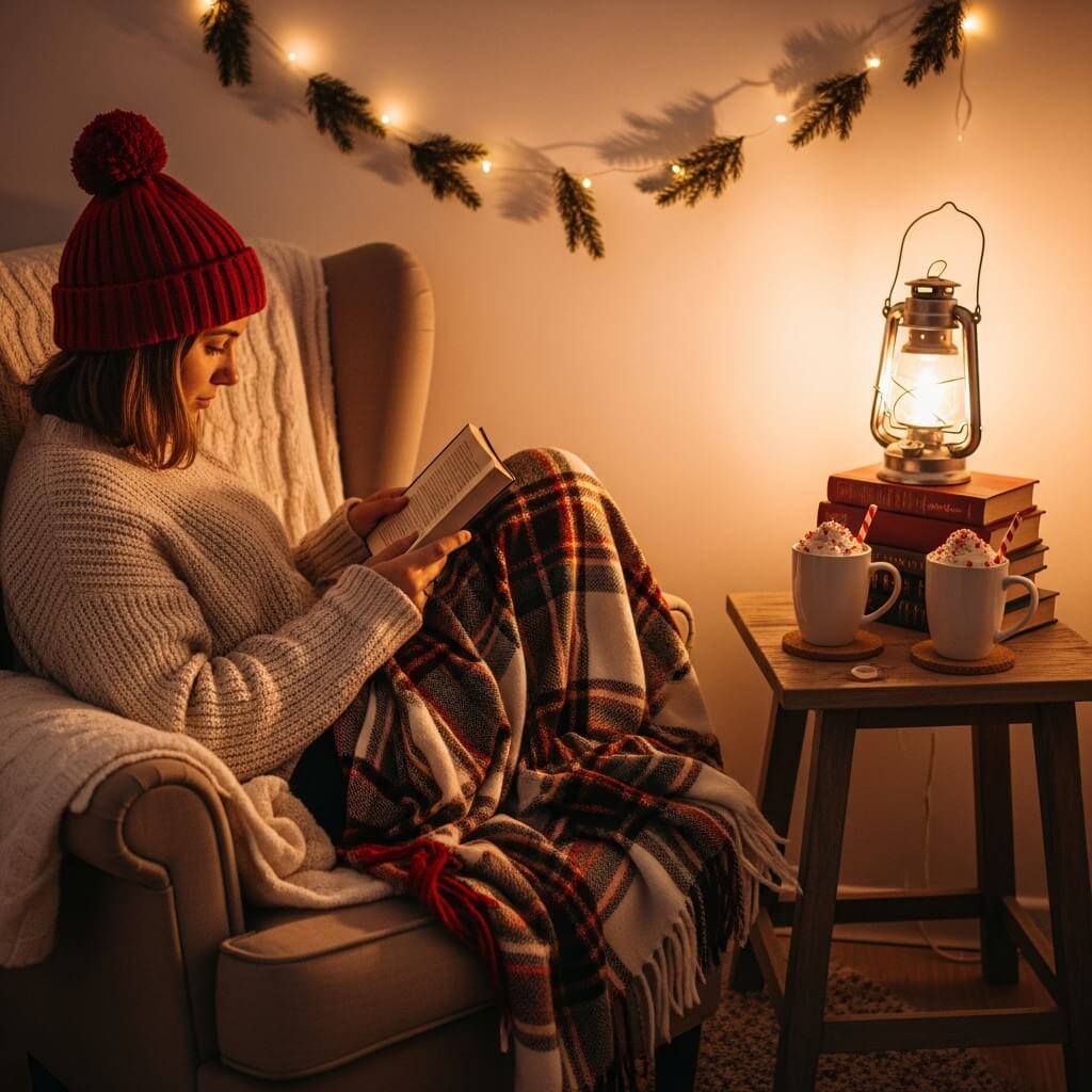 To match the mood, create a holiday reading corner. Add a comfy chair, a plaid blanket, and a side table stacked with books or hot chocolate mugs. Decorate the wall with a string of warm-toned lights or a festive garland.