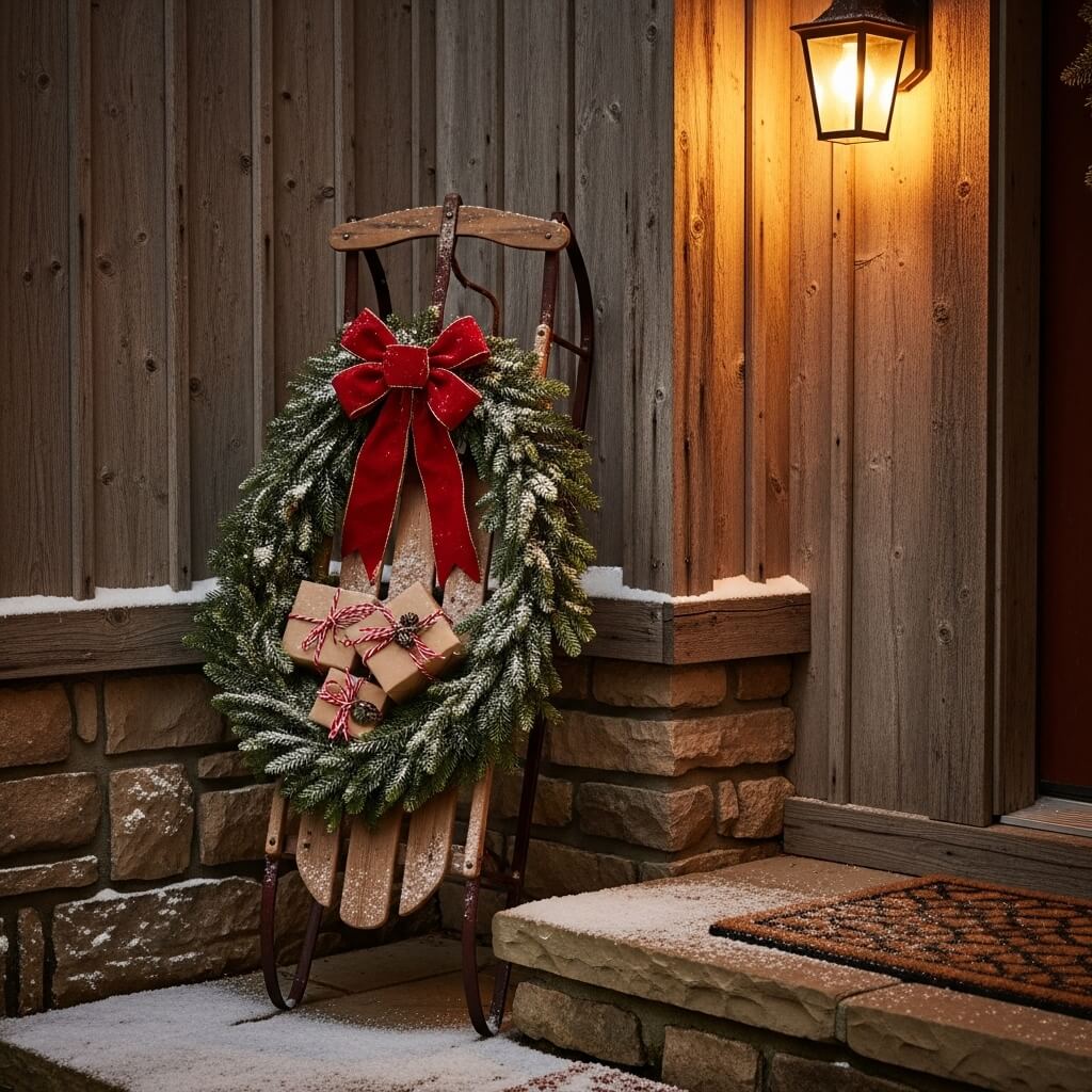 Grab that old wooden sled from the garage or snag a rustic-looking one from a craft store. Lean it against your house next to the front door and style it like a pro. Drape it with a garland, add a big red bow, and maybe even stack a few faux presents on it.