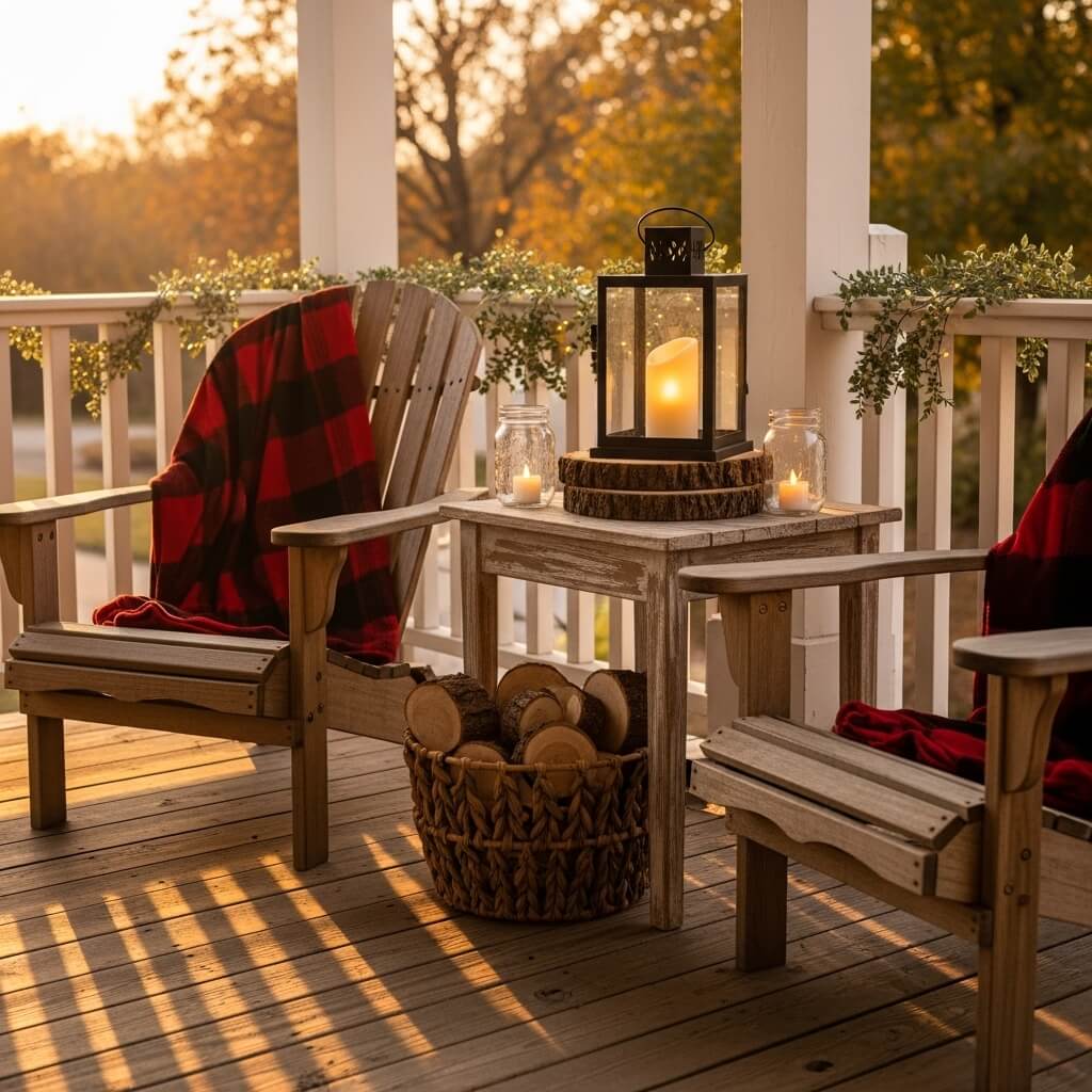 Create an inviting nook on your porch that suggests hot cocoa and carols are happening inside. Arrange a couple of rustic chairs, drape them with cozy blankets, and place a basket of wood slices nearby.