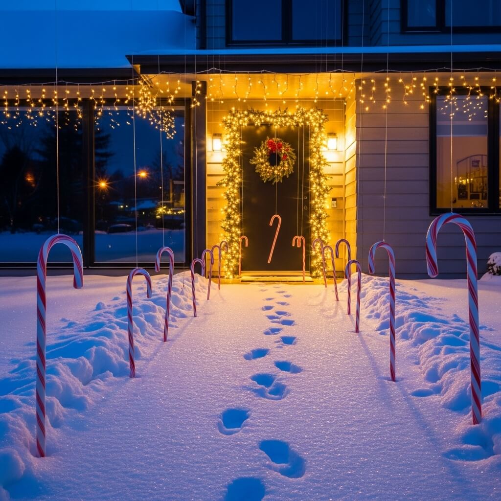 Give the classic candy cane a modern twist. Instead of staking them into the ground, hang them from shepherd’s hooks or the eaves of your house using thin, transparent fishing line. From a distance, they’ll look like they’re magically floating in a row, leading to your door.