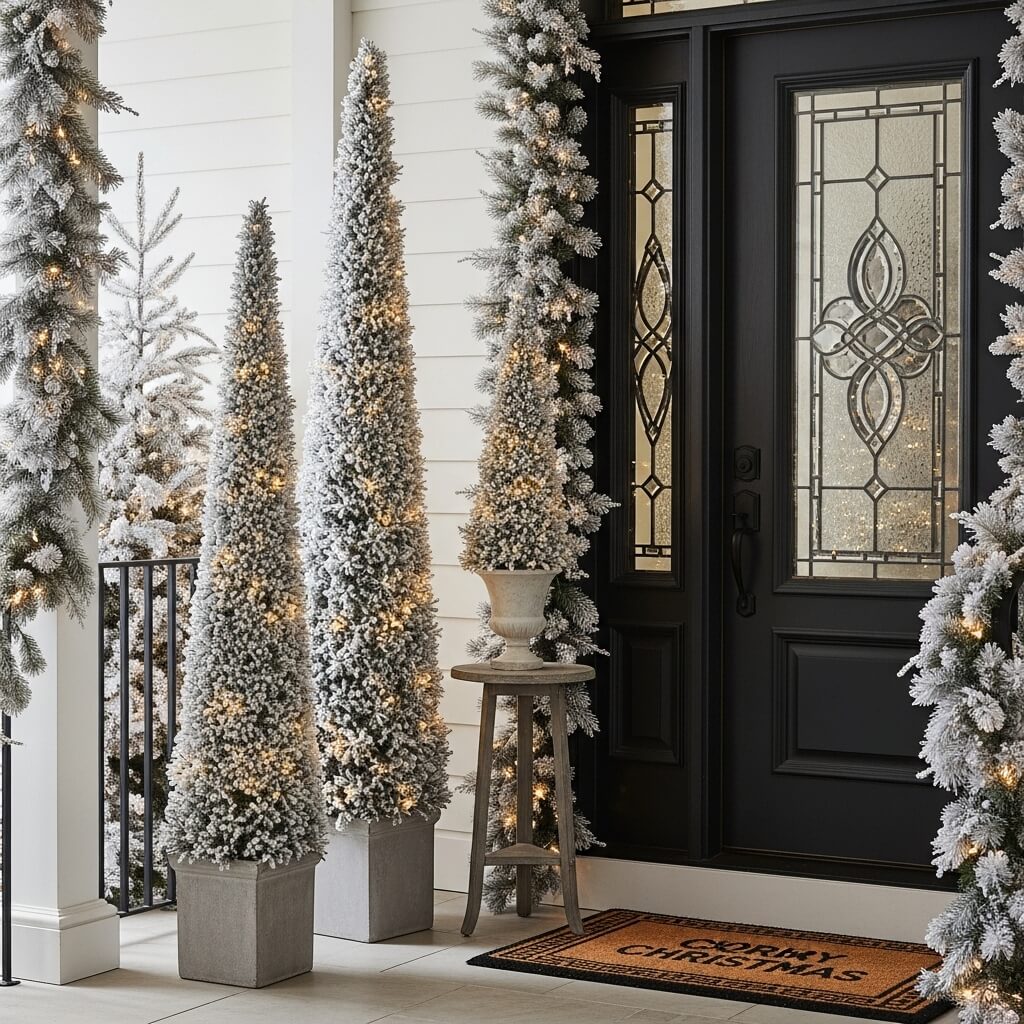 Give your porch some structured elegance with a set of “frosted” topiaries. These faux trees or cones, dusted with a white glittery finish, bring a touch of classy, wintry charm. Flank your door with two larger ones and place a smaller one on a side table for a balanced, designer look.