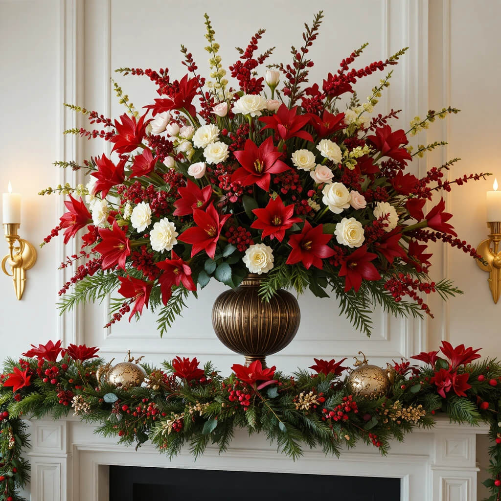 Swap out the classic greenery for a lush, holiday-themed floral arrangement. Think red amaryllis, white chrysanthemums, pine, and hypericum berries. Place it in a beautiful vase as your mantel’s centerpiece. It feels luxurious, fresh, and incredibly elegant.