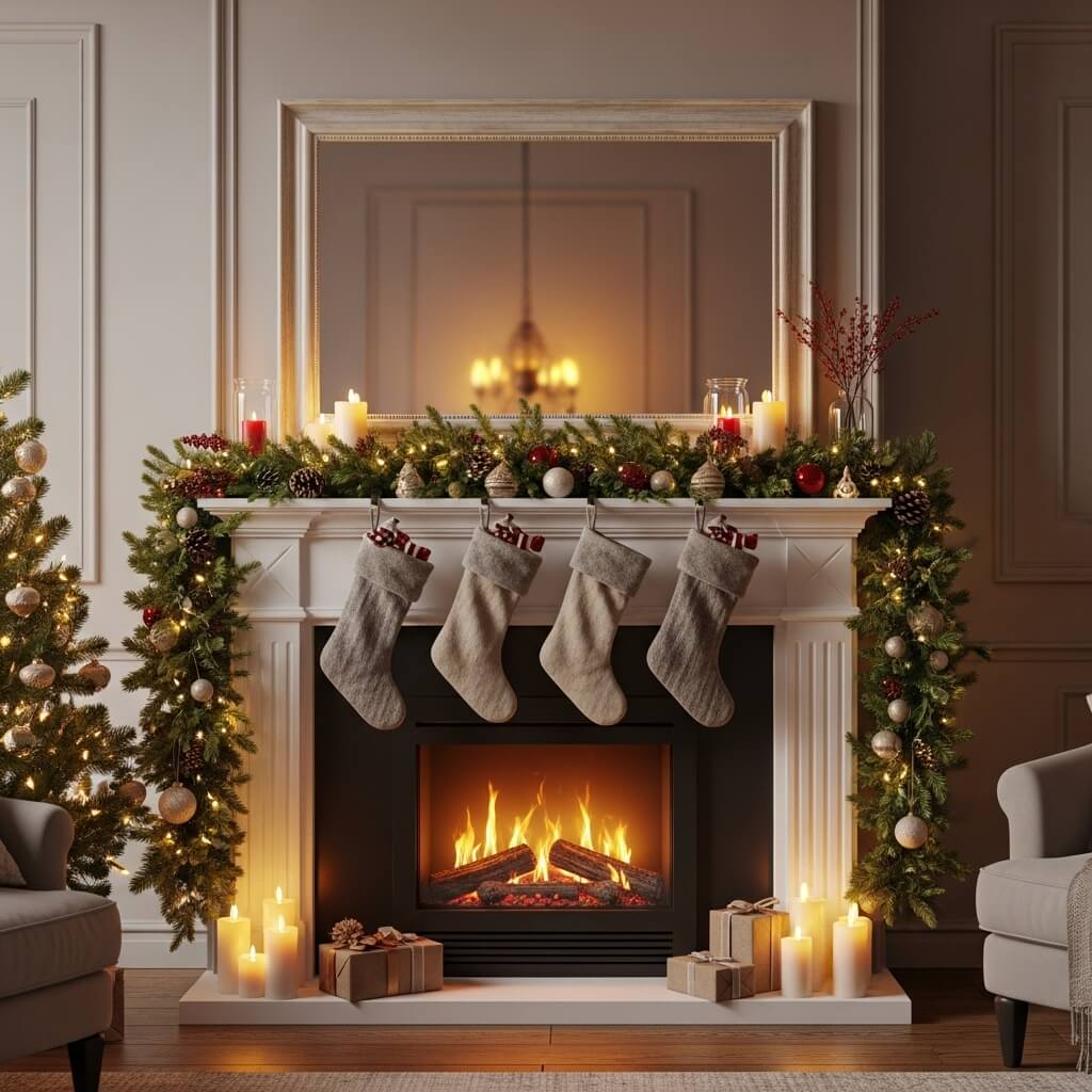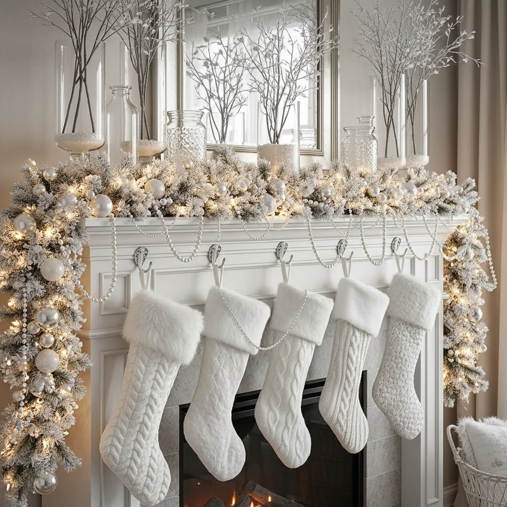 Embrace the magic of a fresh snowfall with an all-white theme. Use a white garland, white pillar candles, white stockings, and pearl or silver accents. It feels incredibly serene, elegant, and brightens up the room instantly. This is one of those Christmas Mantel Decor Ideas that is pure sophistication.
