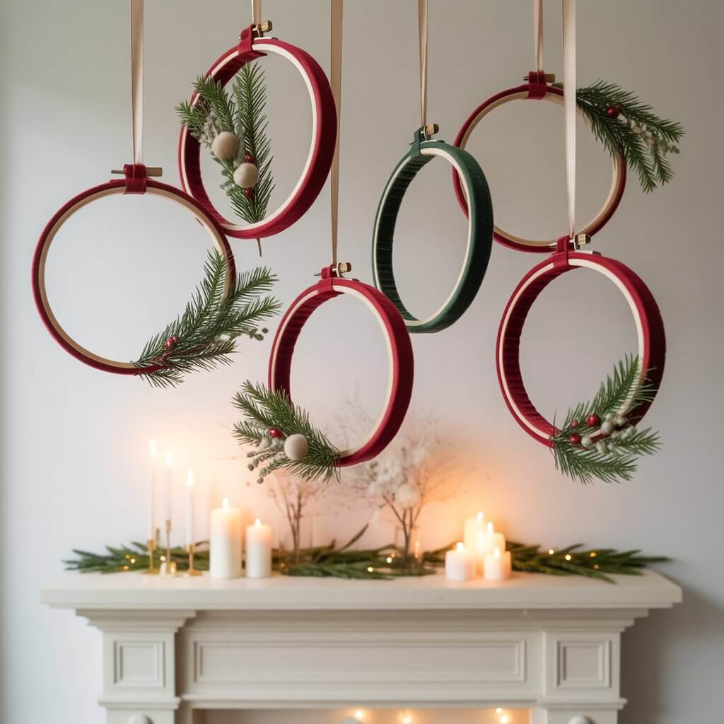 Decorative embroidery hoops are having a major moment, and they make for such a unique and modern Christmas mantel. You can leave them bare for a minimalist look or wrap them with ribbon, greenery, or tiny lights. Hang a few in varying sizes above your mantel for an artistic statement.