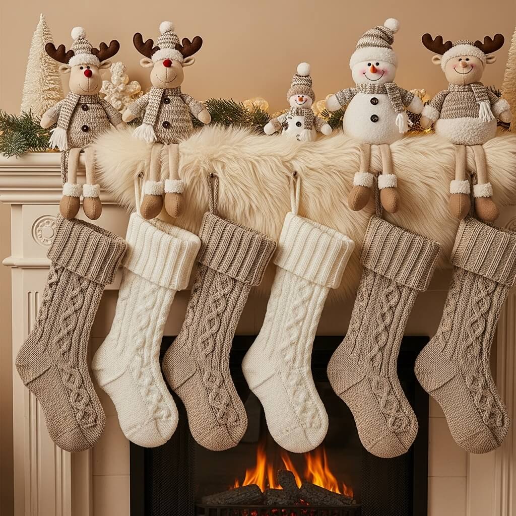 Who says decor can’t be cuddly? Add a ton of cozy texture with knitted stockings, a faux fur mantel scarf, and a few well-placed plush stuffed animals. A cute felt reindeer or a plush snowman peeking out from the greens is just so welcoming.